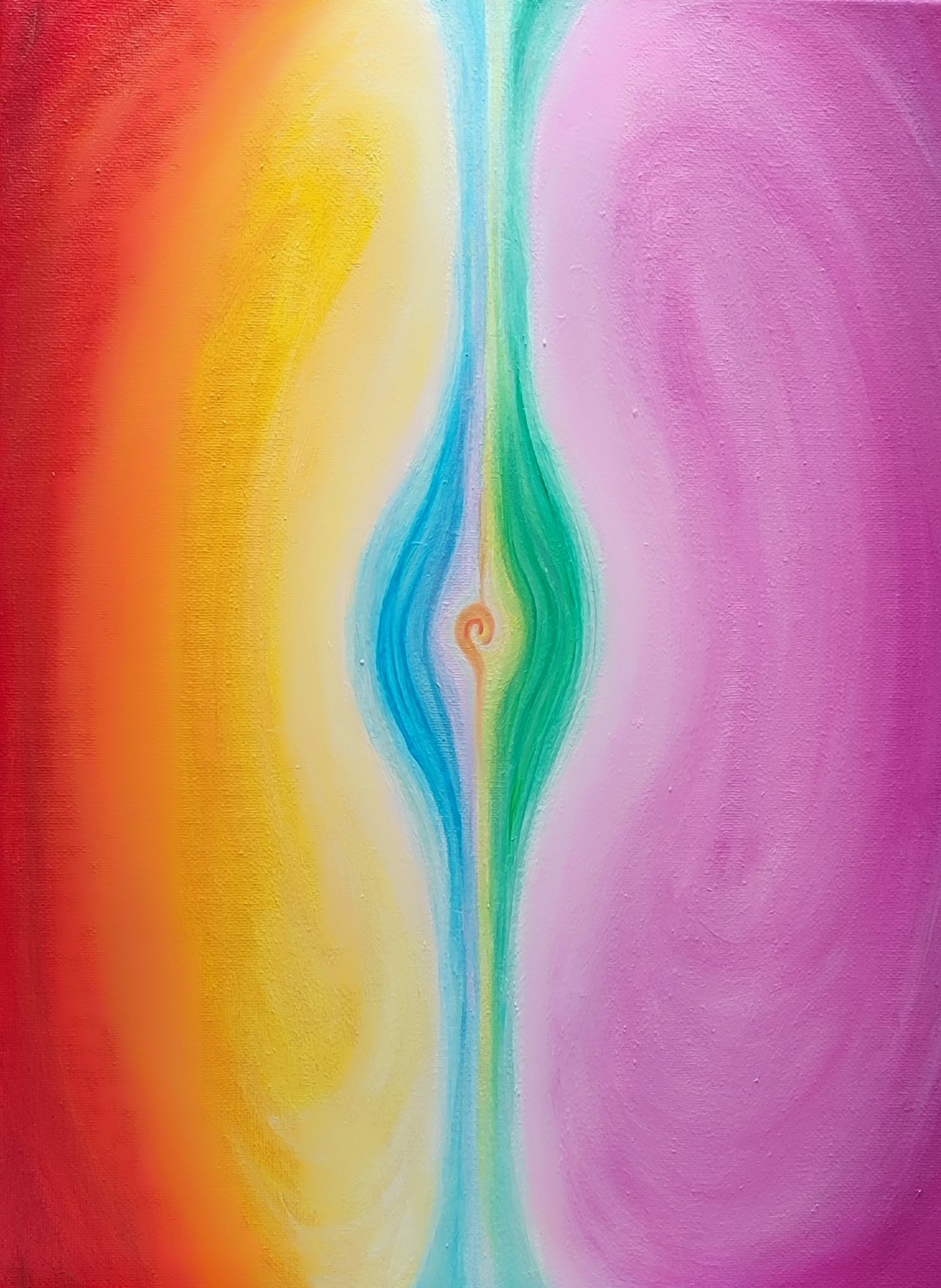 Mitjançant els colors exploro la idea d’un nucli energètic que apareix i s’expandeix, produïnt vibracions que expressen la fusió en el moment en què l’energia cobra vida, i com l’unió d’energies poden ser creadores de matèria, forma com a resultat de les seves vibracions.
